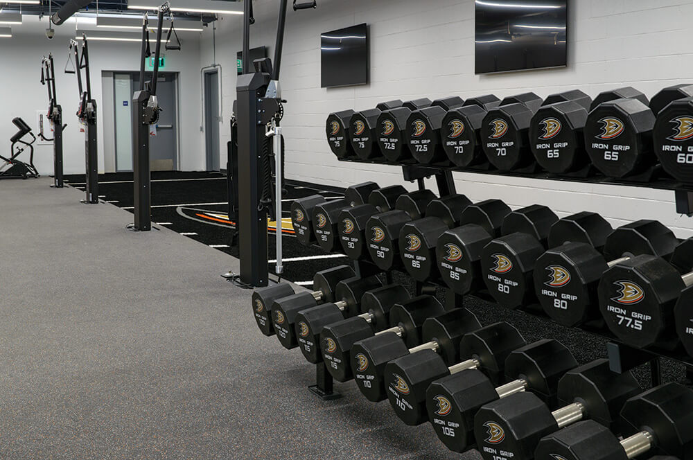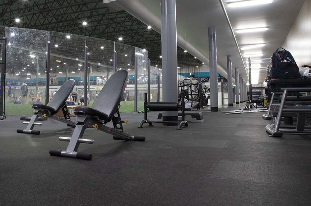 REGUPOL aktivplus is a 1/2" thick, high-density performance floor designed to withstand heavy traffic and high-impact. It is ideally suited for ice rink walkways, benches, locker rooms, training and fitness areas. Thick and dense enough to support weight racks, strength equipment, and Olympic lifting stations commonly found in player development spaces. When paired with REGUPOL Crash Drop Zones, the system allows for flush, inlaid lifting platforms that maximize usable space, enhance athlete safety, and simplify daily cleaning and maintenance—an important consideration in rink environments.